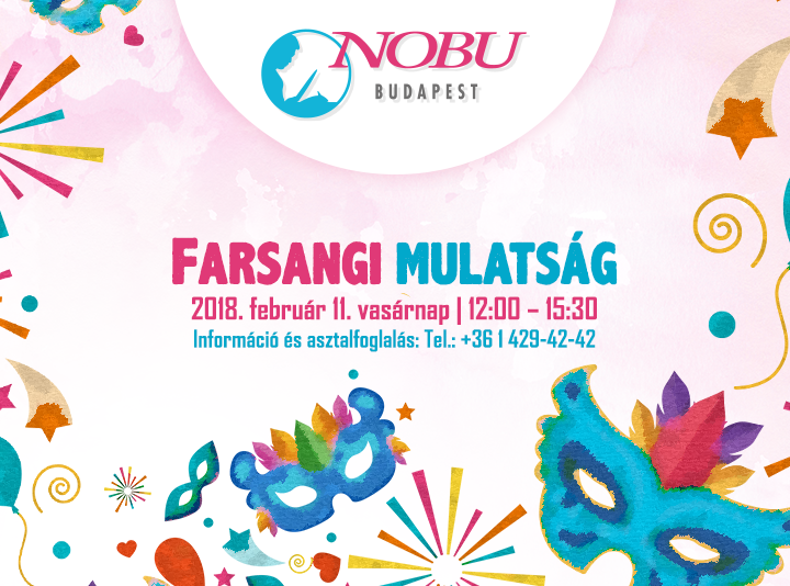 Budapest egyik legexkluzívabb étterme, a Nobu már gőzerővel készül a farsangi időszakra. Vasárnap különleges programmal várják a kicsiket. Farsangi gyereksarok is lesz, melyet az English Garden Pre-School pedagógusainak vezetnek. Lesz még kézműves foglalkozás álarckészítéssel, arcfestés, lufitekerés és néhány bűvésztrükköt is elsajátíthatunk. A részvételi díj 6000 forint + 15% szervízdíj.