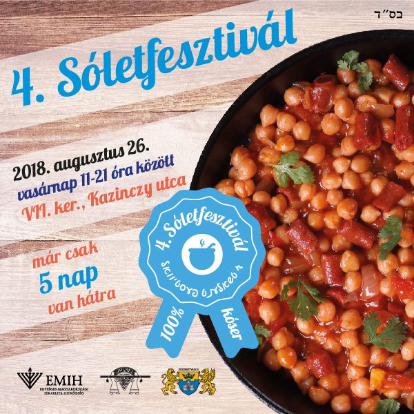 Negyedjére rendezik meg a népszerű zsidó gasztrofesztivál a belváros szívében, a Kazinczy utcában. A résztvevők nemcsak 4 különböző ország sóletjét, hanem számos más tradicionális zsidó ételt és italt is megkóstolhatnak, ezen túl bepillantást nyerhetnek a kóser konyha és zsidó élet rejtelmeibe. Az EMIH által szervezett egész napos fesztiválon a gasztronómiai élmények mellett élő koncertek, gyermekfoglalkozások, kulturális programok várják az érdeklődőket.